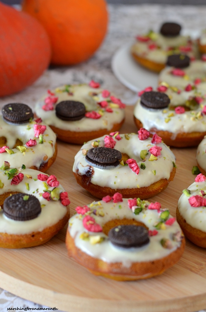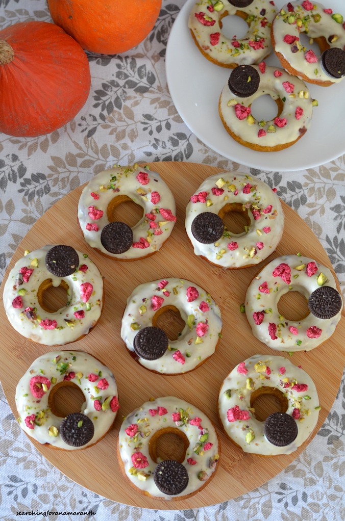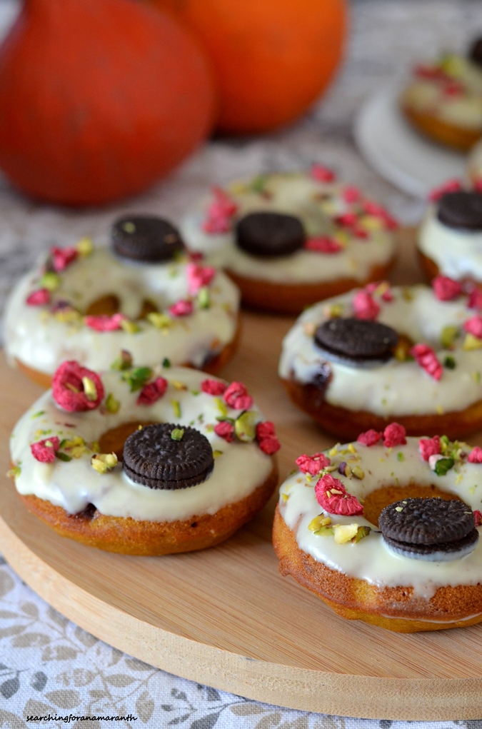Pierwszy wypiek z dodatkiem dyni w tym roku już zaliczony. Przygotowałam pieczone donaty, które dzięki dyniowemu puree mają piękny kolor i są cudownie miękkie. Moje donaty nadziewałam powidłami śliwkowymi. Jednak ciasto dyniowe jest dość wilgotne i nie wszystkie wyszły nadziane tak jak bym chciała. Także spokojnie można pominąć ten etap. Dyniowe ciasto pachnące cynamonem, biała czekolada, mini oreo, pistacje i liofilizowane maliny. Bardzo udane połączenie!