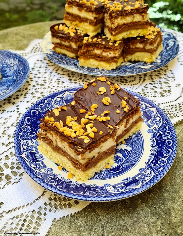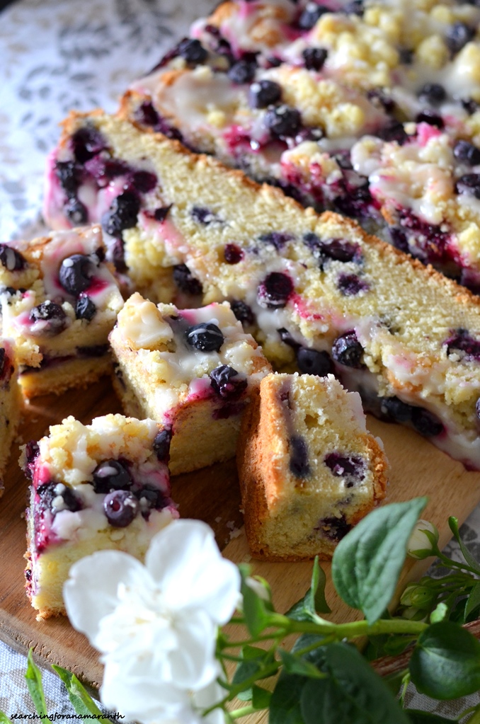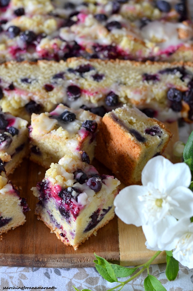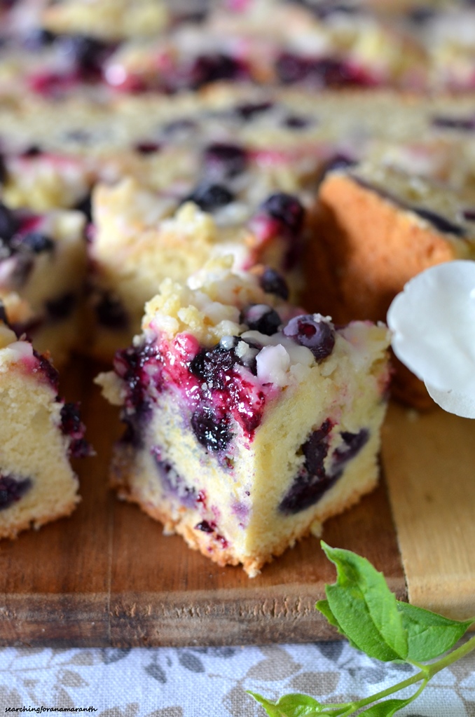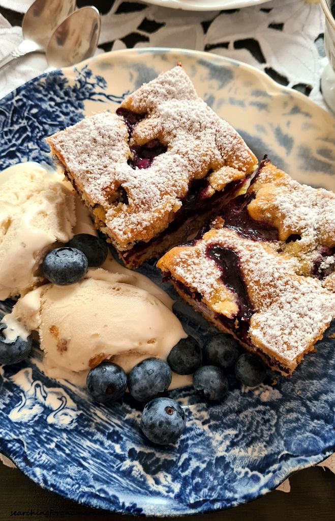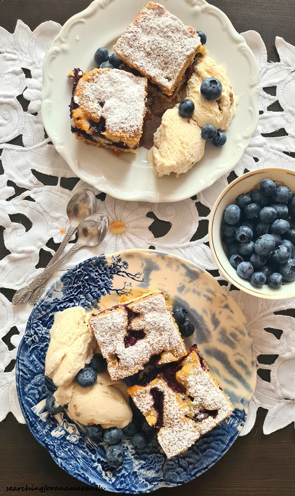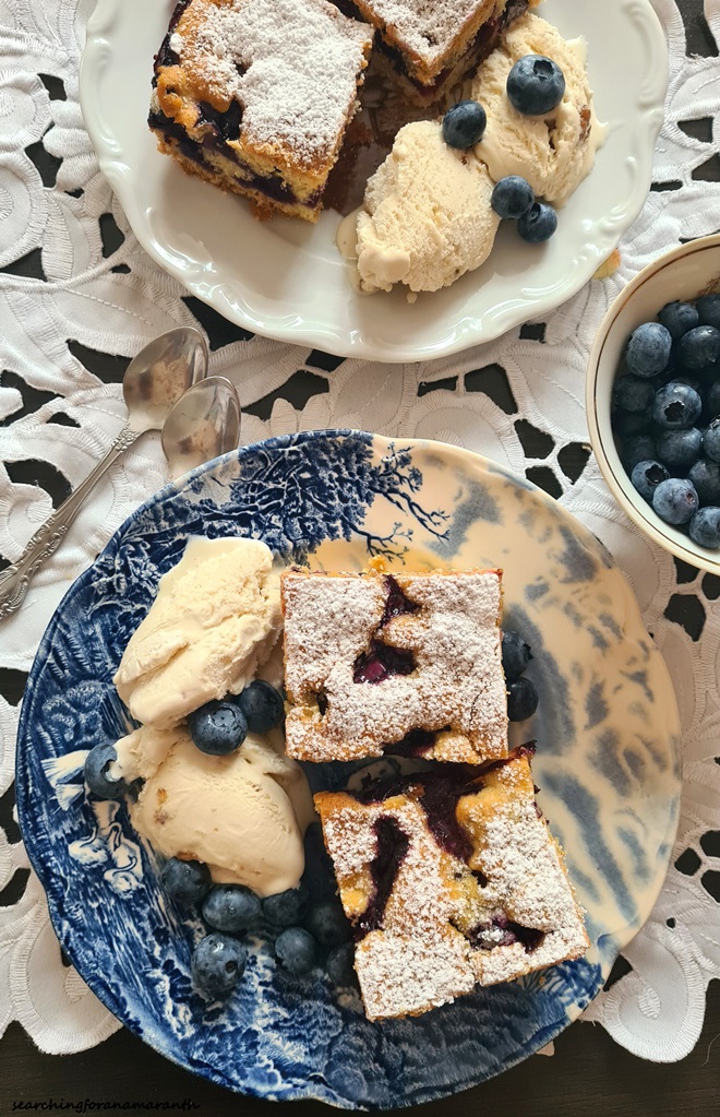 Formę o wymiarach ok 22×34 cm wyłożyć papierem do pieczenia. 2/3 ciasta wylepić na spód, rozłożyć borówki wymieszane z mąką ziemniaczaną. Na wierzchu wyłożyć pozostałe ciasto (najlepiej odrywać i spłaszczać kawałki ciasta, maczając ręce w mące). Piec w temperaturze 180stopni przez 45-50 minut lub do zarumienienia. Po wystudzeniu posypać cukrem pudrem. Podawać z lodami i świeżymi borówkami.