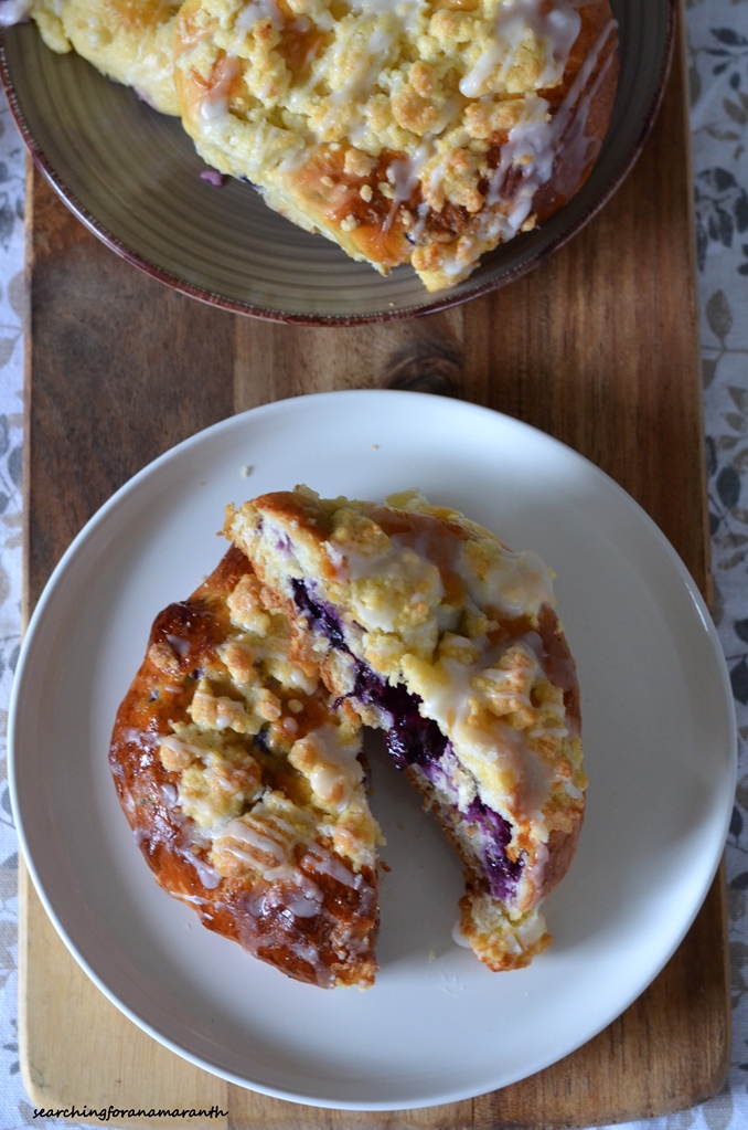 Drożdże rozpuścić w lekko ciepłym mleku (najlepiej w dużej misce, w której zarobimy ciasto), dodać 3 łyżki mąki i łyżkę cukru, wymieszać, poczekać aż zaczyn zacznie rosnąć. Dodać pozostałą mąkę, cukier, jajka, skórkę z cytryny, mascarpone, roztopione masło. Wymieszać łyżką, a następnie zagnieść na gładkie i elastyczne ciasto, w razie potrzeby można dosypać mąkę. Przykryć ściereczką, odstawić do wyrośnięcia na godzinę. Po tym czasie zagnieść, wyłożyć ciasto na dużą blaszkę z piekarnika wyłożoną papierem do pieczenia. Ułożyć jagody , posypać kruszonką. Piec w temperaturze 180st grzałka góra-dół, przez 35-40 minut lub do suchego patyczka. Po ostudzeniu udekorować lukrem przygotowanym z cukru pudru i soku z cytryny.