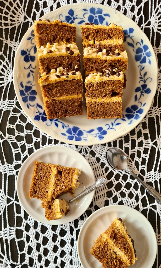Zostało mi sporo dyniowego puree, pomyślałam więc że do piernika nada się idealnie. Miękki, wilgotny, pięknie pachnący piernik przełożony kremem dyniowym. Pyszności. Bardzo polecam na święta.
